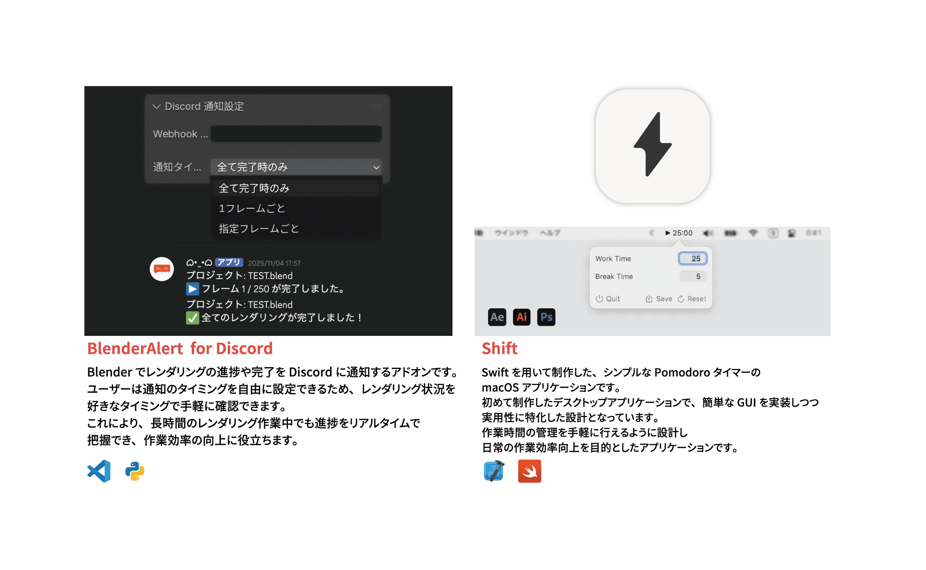 加えて、Blenderのレンダリング進捗をDiscordへリアルタイム通知するアドオンや、Swift製の自作タイマーアプリなど、制作の課題を解決するプログラムを制作している。