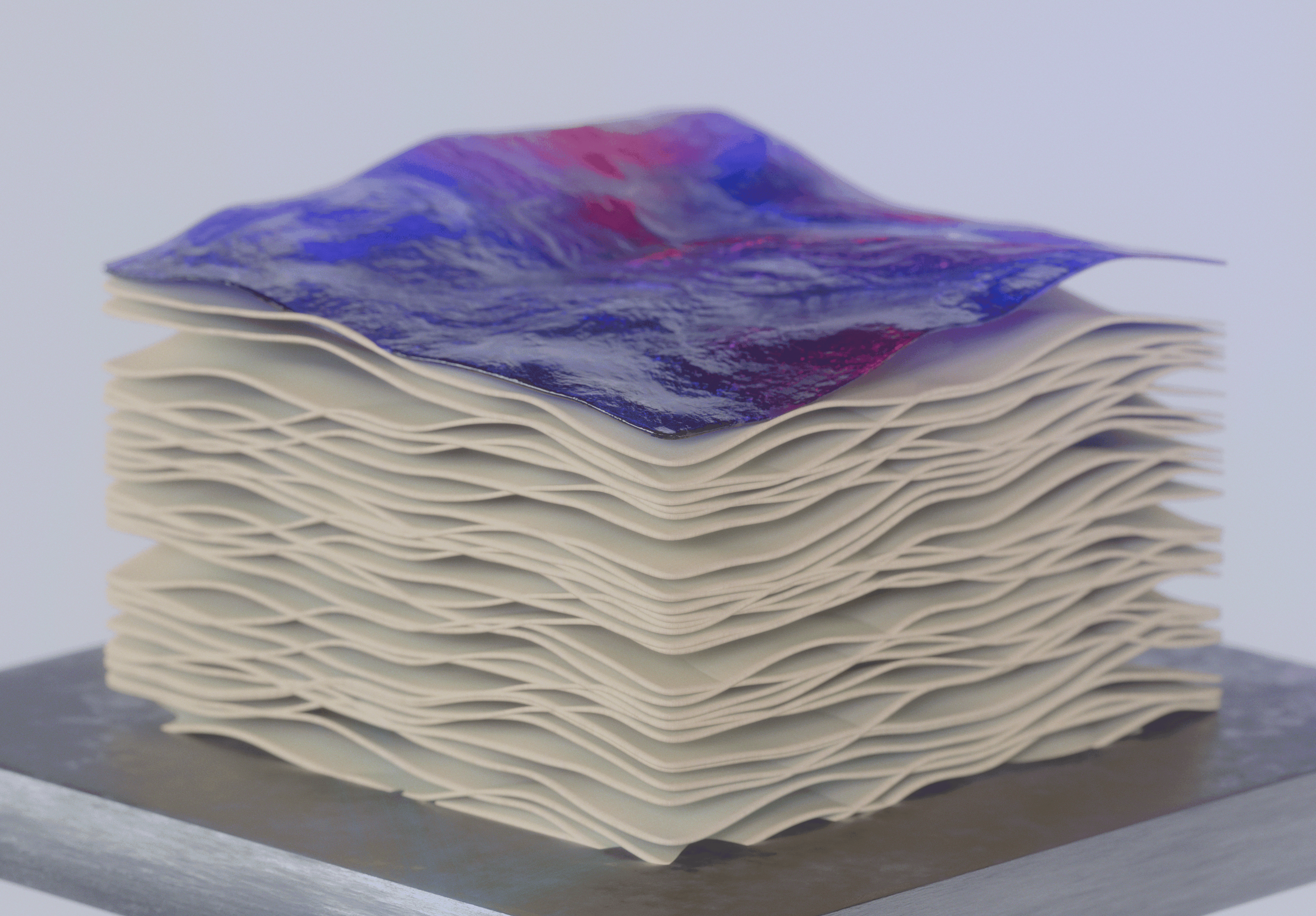金属板上の微細な凹凸やザラつきといった物質的な質感を3DCGマテリアル表現によって忠実に再現 。